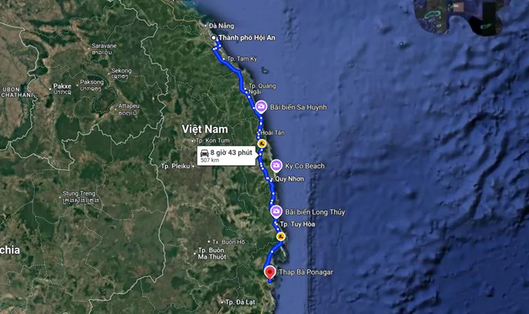 Image of distance from Hoi An to Nha Trang on the map - Photo source: Google Maps