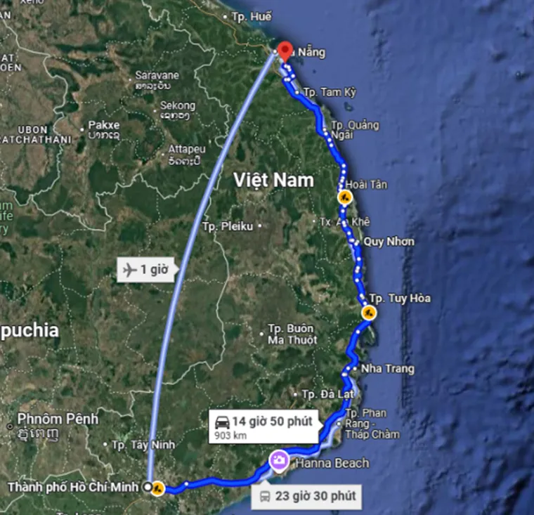 Distance from Saigon to Hoi An. - Photo source: Google Maps