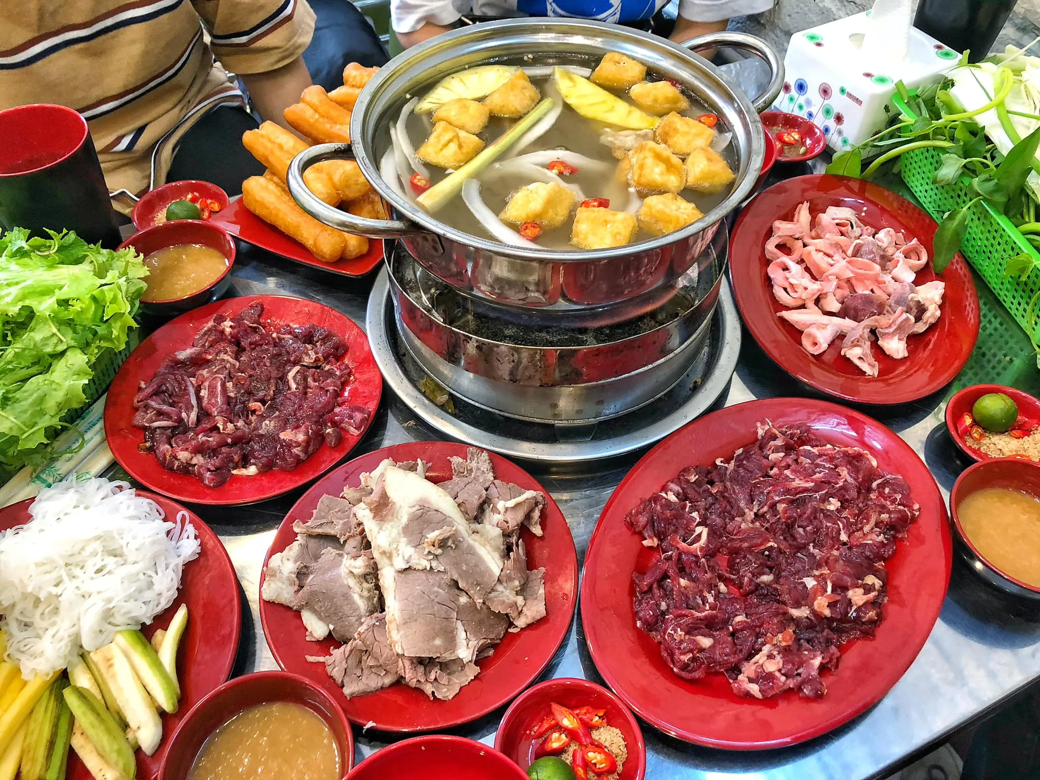 This unique hotpot dish features thinly sliced beef cooked briefly in a tangy vinegar broth, served with fresh herbs, rice paper, and dipping sauces for a deliciously interactive dining experience.