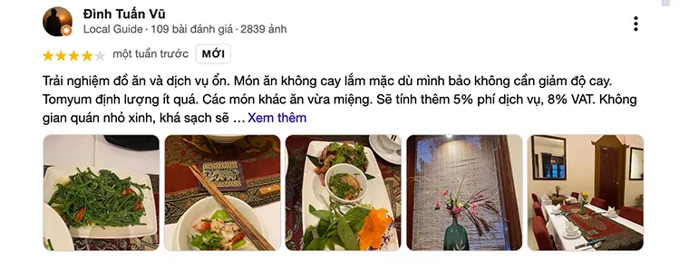 Dinh Tuan Vu: "Decent food and service experience. The food wasn't very spicy even though I asked them not to reduce the spice level. The Tom Yum portion was too small. The other dishes were palatable. They will add a 5% service fee and 8% VAT. The restaurant space is small and pretty, quite clean."