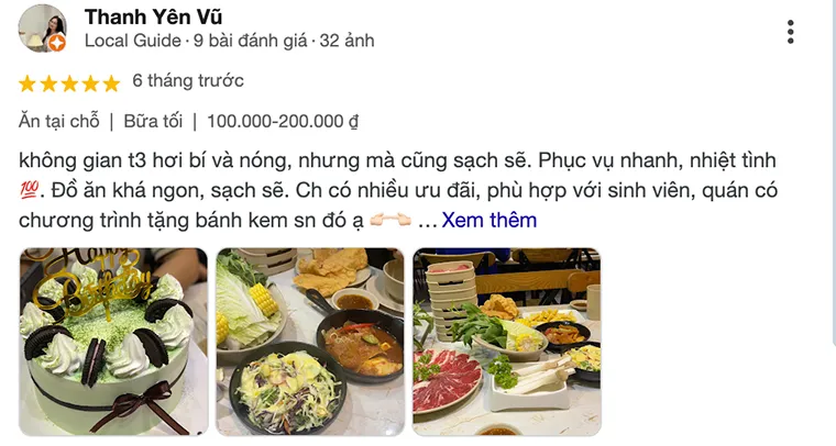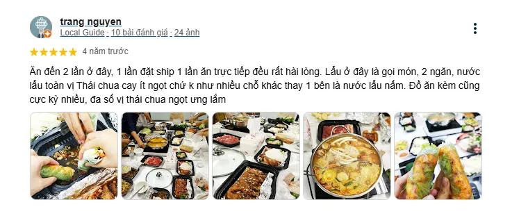 Trang Nguyen: "I've eaten here twice, once ordered for delivery and once dined in directly, and both times I was very satisfied. The hotpot here is a la carte, with two compartments, and the broth has a full Thai sour and spicy flavor with less sweetness, unlike many other places that replace one side with mushroom broth. The accompanying dishes are also extremely plentiful, mostly with a sour and sweet Thai flavor that I really liked."