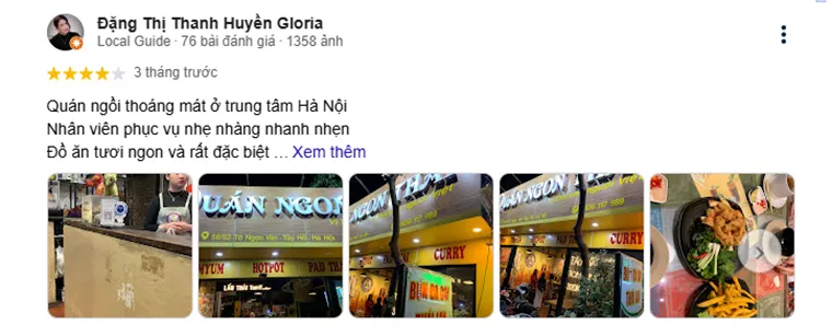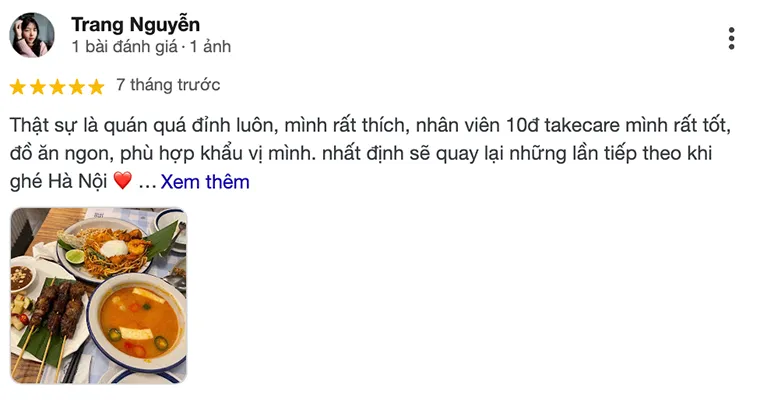 Trang Nguyen: "Honestly, this restaurant is absolutely amazing, I really like it, the staff gets a 10/10 for taking such good care of me, the food is delicious and suits my taste. I will definitely come back the next times I visit Hanoi ❤️"