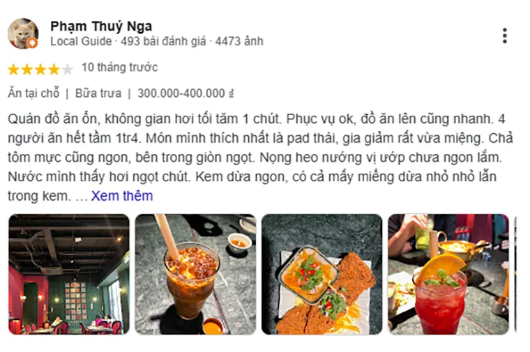 Pham Thuy Nga: "The food at the restaurant is decent, the space is a bit dark. Service is okay, the food is served quickly. Four people ate for around 1.4 million VND. My favorite dish is the Pad Thai, the seasoning is just right. The shrimp and squid patties are also tasty, crispy and sweet inside. The grilled pork jowl's marinade wasn't very good. I found the drinks a bit sweet. The coconut ice cream is delicious, with small pieces of coconut mixed in."