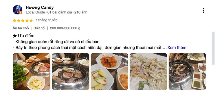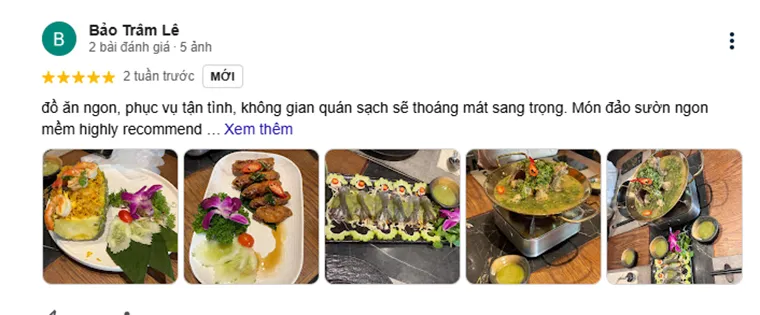 Bao Tram Le: "Delicious food, attentive service, the restaurant space is clean, airy, and elegant. The grilled ribs dish is delicious and tender, highly recommend."