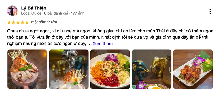 Ly Ba Thien: "Sour and sweet, mild and delicious. The space only makes the Thai food here even tastier, my friend. I just ate here with my friend. I will definitely bring my wife and family here to experience the extremely delicious dishes, I ate ribs, shrimp, and shrimp noodles... I don't remember the Thai name for this dish. Maybe I'll have to come here many times to remember the names of these dishes."
