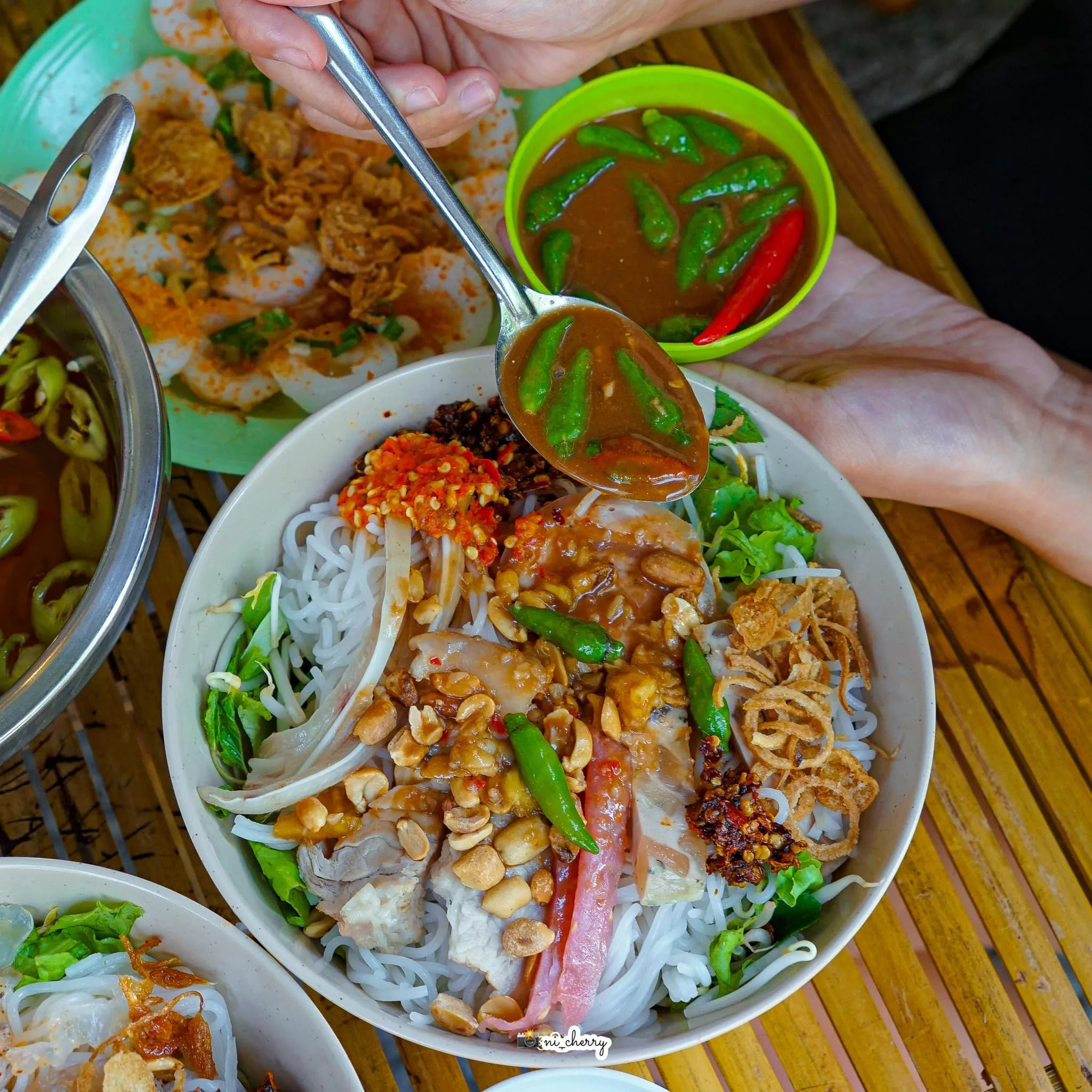 Rice vermicelli with anchovy fish sauce and crispy roast pork.