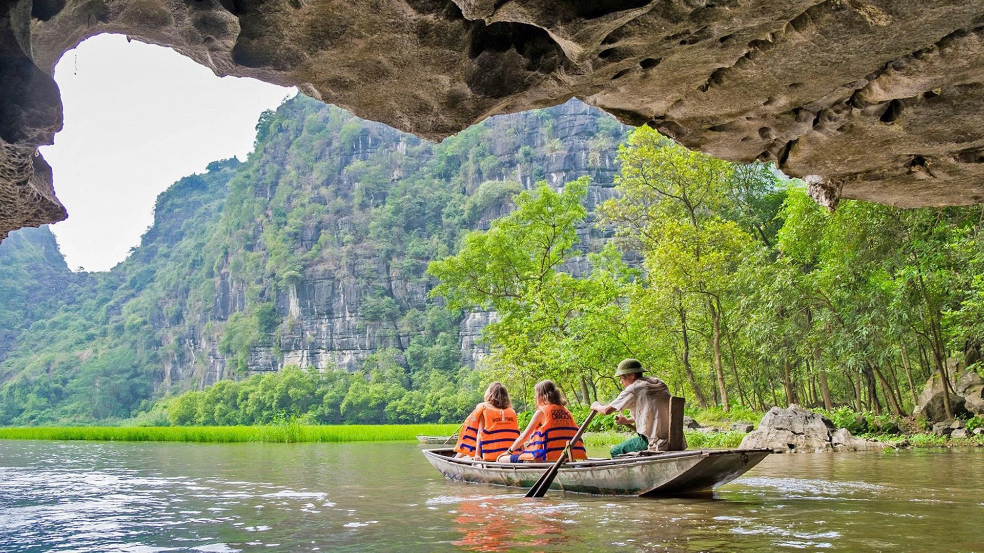 1:30 PM (1:30 PM): Guests board a boat to visit Tam Coc. Tam Coc means "Three Caves": Hang Ca (First Cave), Hang Hai (Second Cave), and Hang Ba (Third Cave). The entire round-trip water journey takes about two hours. Rowing boats will take visitors through Hang Ca, the largest and most beautiful cave, which is 127m long, situated under a large mountain across the Ngo Dong River. Visitors will feel the fresh, cool air of the countryside as they go deep inside the cave, with sparkling stalactites dripping from the ceiling like magical jewels. The water journey continues through Hang Hai and Hang Ba, which are equally magnificent.