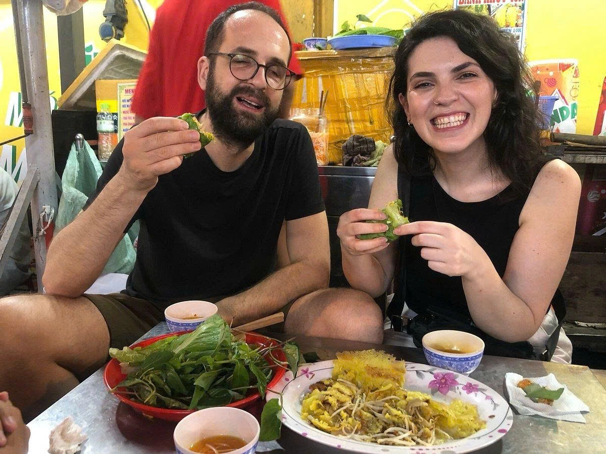 Next, we leave the tourist track behind and head to local neighborhoods for an authentic food experience. Start with Vietnam’s famous Banh Xeo—a giant crispy pancake filled with shrimp, pork, and fresh vegetables, served with homemade dipping sauces. You’ll also taste its smaller cousin, the bite-sized Mini Pancake, golden and crispy, packed with shrimp, pork, or squid.