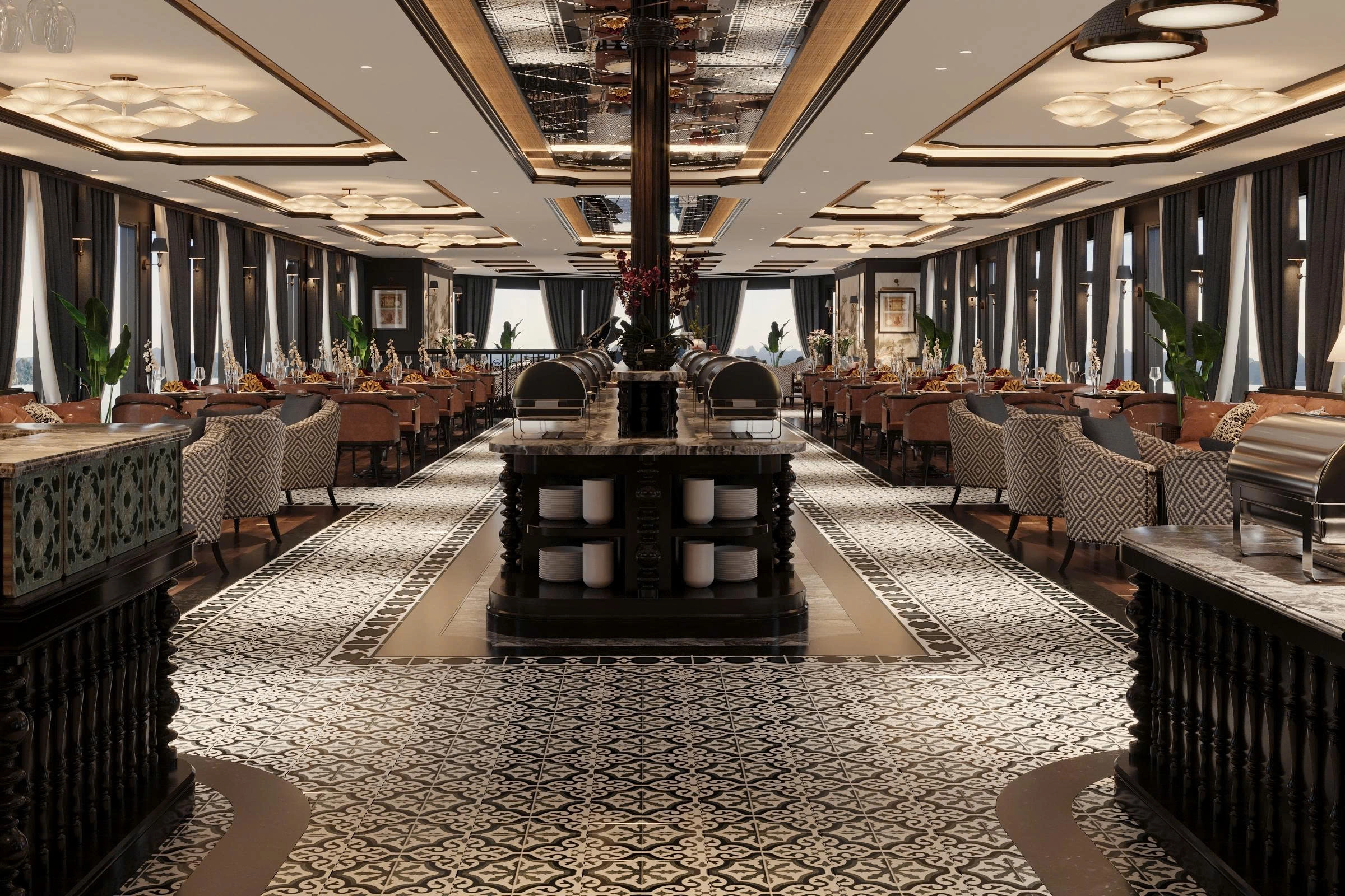 Rest in cabins and suites equipped with premium furnishings, featuring private balconies where guests can admire panoramic views of the legendary limestone karsts right from their room.