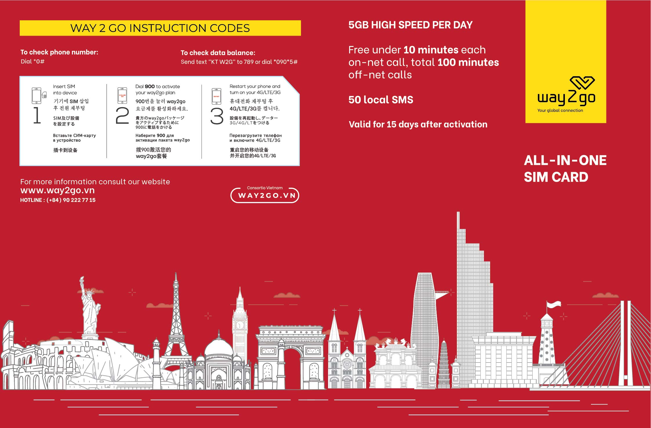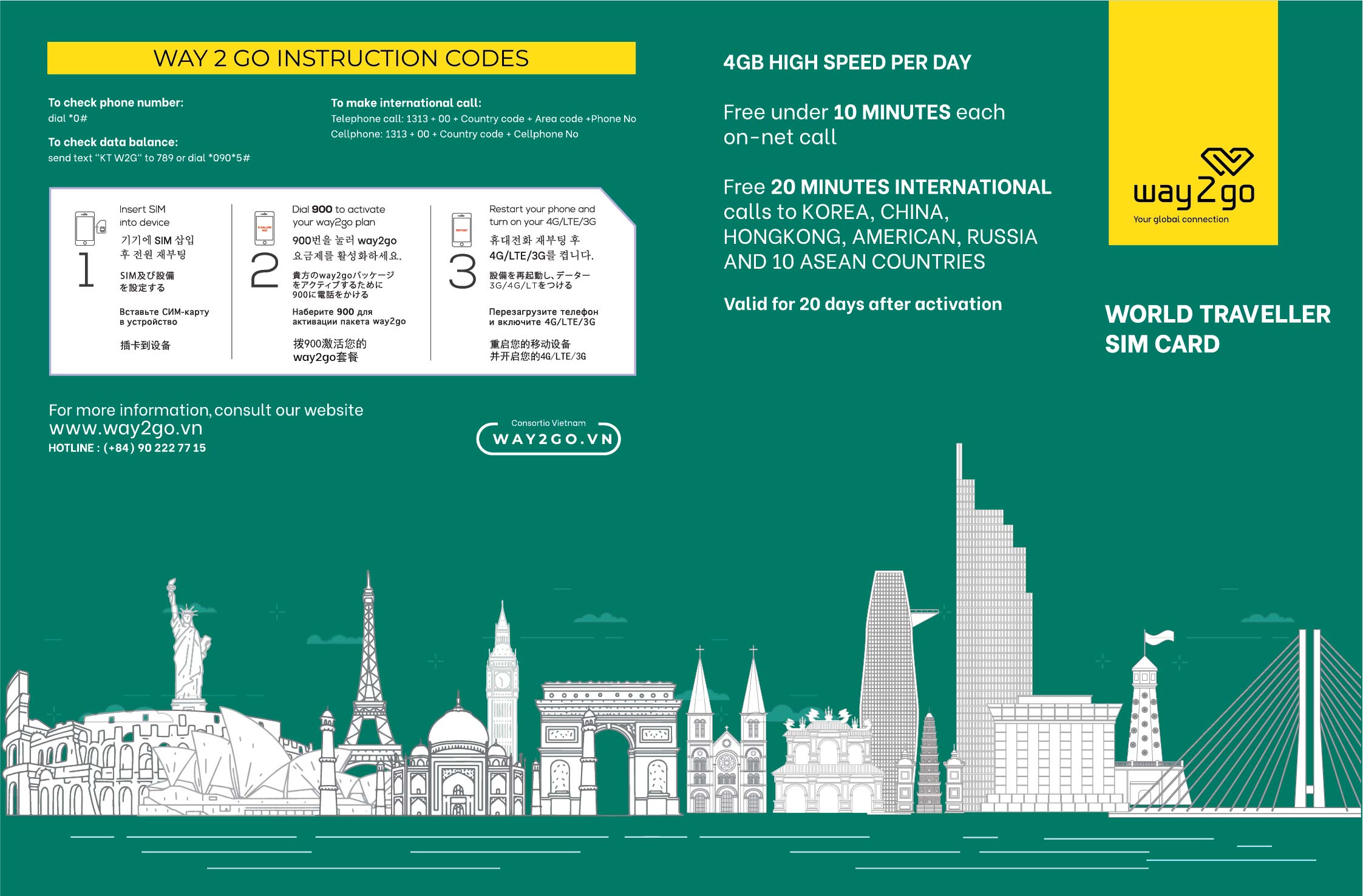 - 20 minutes free international calls to countries: South Korea, China, Hong Kong, USA, Russia, and 10 ASEAN countries.