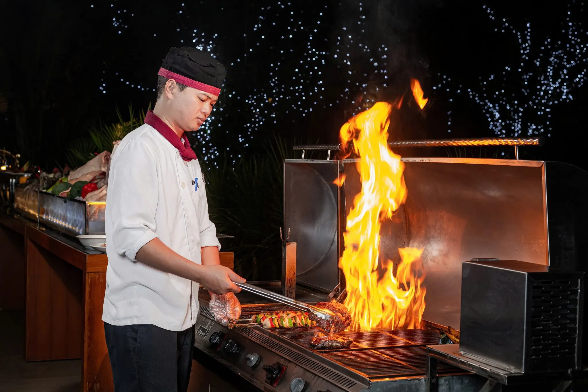 Bạn có thể trực tiếp quan sát các đầu bếp tài ba của chúng tôi chế biến những món ăn tươi ngon, từ hải sản tươi sống, các món nướng thơm lừng, đến sushi và sashimi tinh tế.
